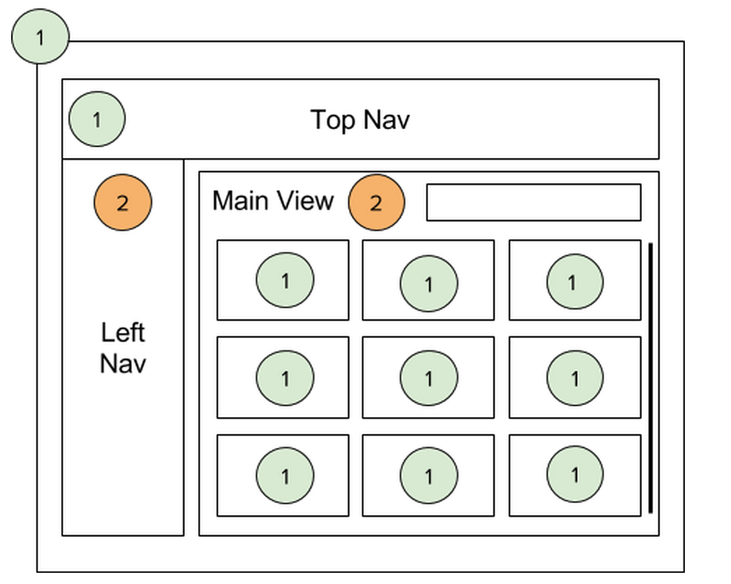 For example, you may have an app that looks something like the diagram below. To get your feet wet with Angular 2, you decide to upgrade the left nav to an Angular 2 component. Once you're more confident, you decide to take advantage of Angular 2's rendering speed for the scrolling area in your main content area.